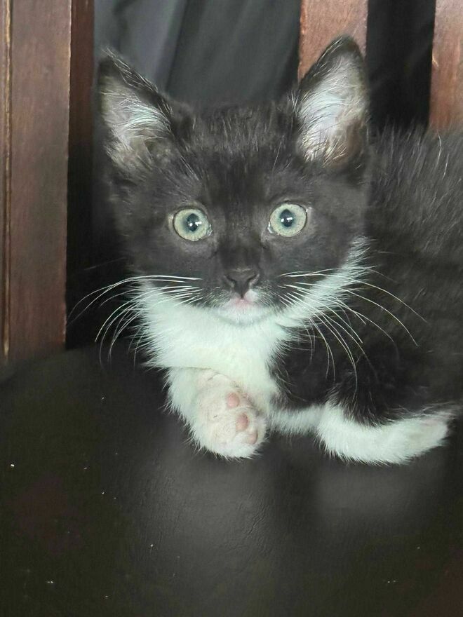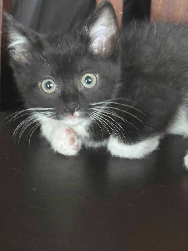 Kotek wykarmiony butelką, bardzo kontaktowy, traktujący człowieka, jak większego kota bo skąd pamiętać matkę i wiedzieć, że jest się kotem