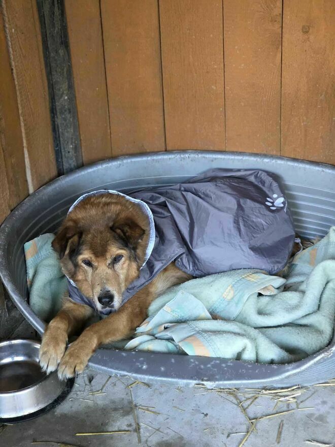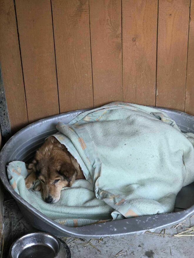 Kufel, tak zimy nie przetrwa, jest coraz bardziej smutny i zrezygnowany. Niestety nie wie co to buda, bo musiał być psem domowym i na nic nasze zachęty smaczkami, nie chce wejść i już.Kufel na pewno już osiągnął pełnoletność dużo śpi, lubi jeść i lubi spacerować.